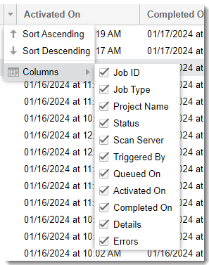 2. Move the cursor to the Columns option in the menu. The list of all columns available in the Jobs queue is displayed to right of Columns .