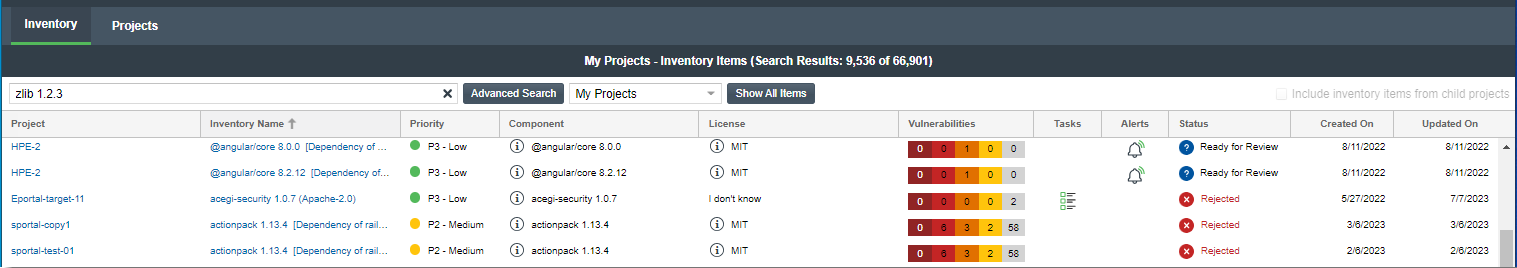 The Inventory view highlights the important properties for the inventory—the project to which the inventory is associated, the number of known security vulnerabilities, inventory review status, whether the inventory has open task or alerts, and more—enabling you to quickly review the listed inventory items for areas concern or interest. Some properties include links to additional information, enabling you to explore an inventory item in more depth.