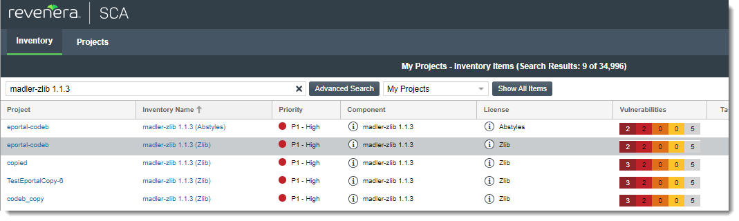 If a specific inventory item listed on the Inventory view has associated security vulnerabilities, a bar graph is visible in that item’s row, showing the vulnerability counts for the item within the context of its listed project.