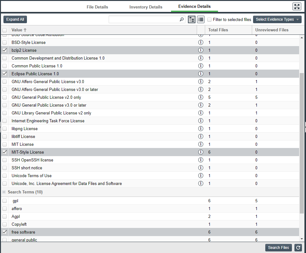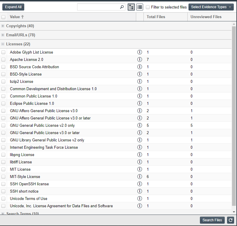 In each category list, you can view the total number of files containing evidence at the category level, the total number of files containing evidence for each instance, and the number of those files that are not marked as reviewed. For each instance of license evidence, you can click the icon to view information about the license.