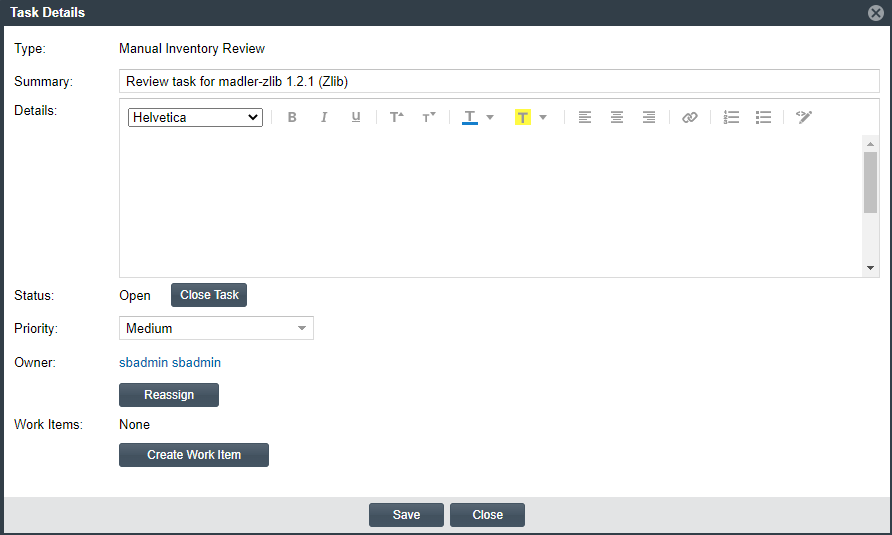 - To update the task fields or add an external work item, refer to the descriptions in Manually Creating a Task.
